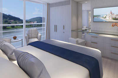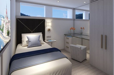 Unser eleganter Neubau im italienischen Stil, komfortable, geräumige Ein- und Zweibettkabinen, großzügige Junior-Suiten mit franz. Balkon, luxuriöse Suiten mit eigenem Balkon. Einladendes Sonnendeck mit Liegestühlen, Sonnensegeln und Bar/Buffet (wetterabhängig), exklusive Tintoretto Lounge und Panorama-Bar mit fantastischem Rundum-Ausblick sowie Glaskuppel und windgeschützter Außenbereich vor der Tintoretto Lounge. Edles Tiepolo Restaurant für kulinarische Genüsse, stilvolle Canaletto Lounge/Restaurant achtern, mondäne Rezeption mit Lobby und ein kleiner, moderner Fitness-Bereich. WLAN (gegen Gebühr). TOP: Fahrstuhl bzw. Treppenlift zu allen Decks